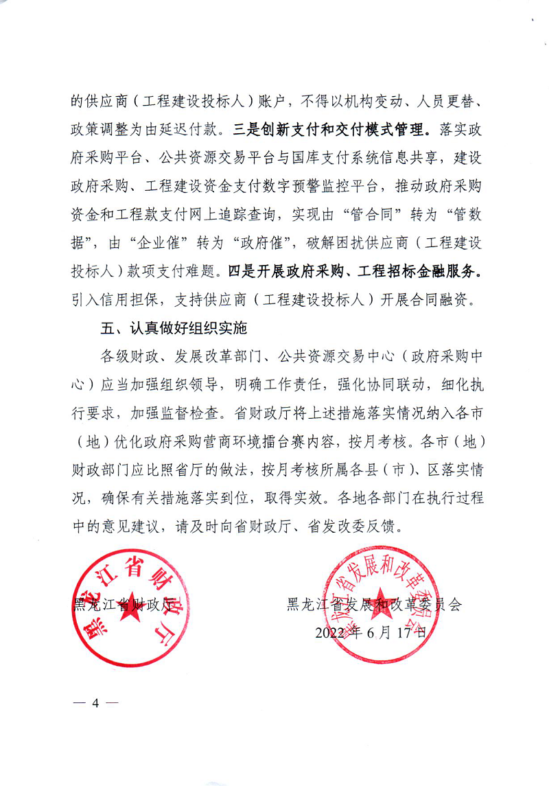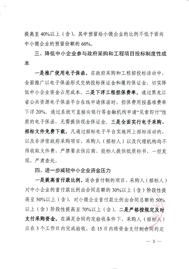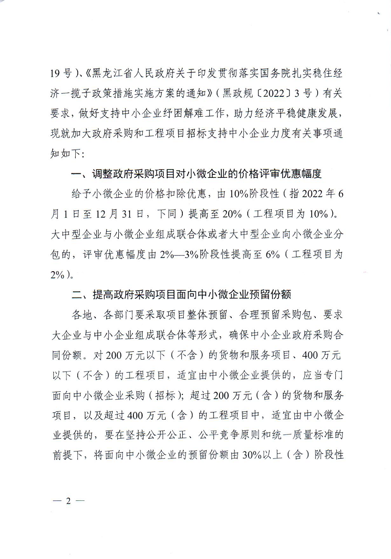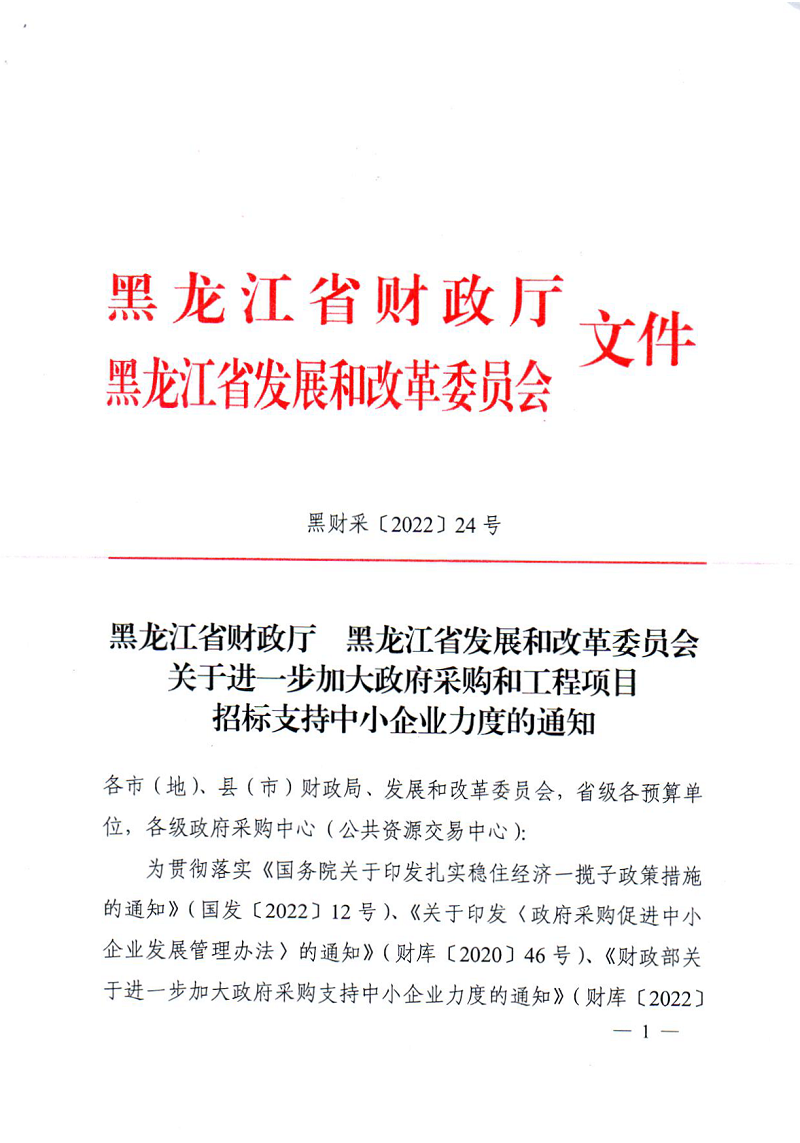 黑龙江省财政厅 黑龙江省发展和改革委员会关于进一步加大政府采购和工程项目招标支持中小企业力度的通知 (黑财采[2022]24号)